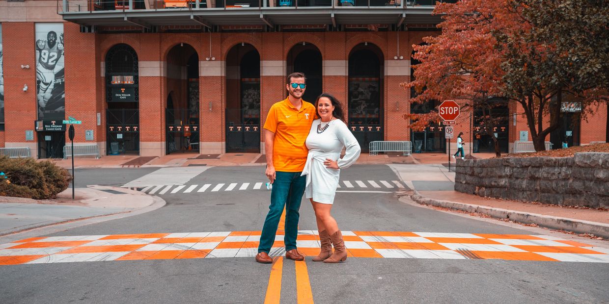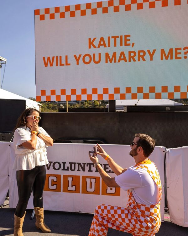 We were at a tailgate on a barge on the Tennessee River hosted by the Volunteer Club before the Tennessee vs Florida football game. One of the photographers in charge of social media for the Volunteer Club asked to take our picture in front of a large projection screen. While they were taking the picture, they displayed “Kaitie, will you marry me?” on the screen, and Michael got down on one knee.